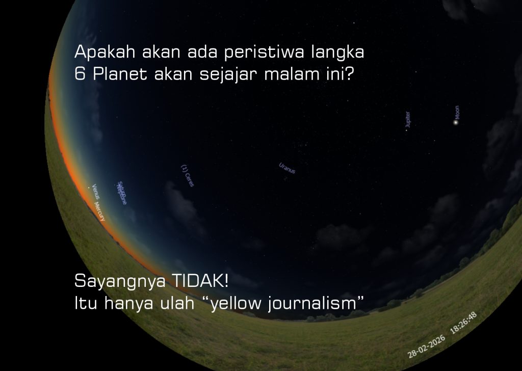Berita tentang apa yang disebut sebagai “Kesejajaran Planet” dimana 6 Planet akan membuat parade di Langit 28 Februari 2026 ini begitu viral di media sosial. Namun sayang berita tersebut tidak memperhitungkan fakta pengamatan yang sesungguhnya. Ya inilah “Yellow Journalism” yaitu pemberitaan yang lebih mementingkan sensasionalisme dan judul yang bombastis daripada akurasi atau fakta yang objektif untuk kepentingan LIKE dan VIEW sesaat tanpa memperhitungkan kode etik jurnalistik. Sangat disayangkan keberadaan jurnalis yang seperti itu.