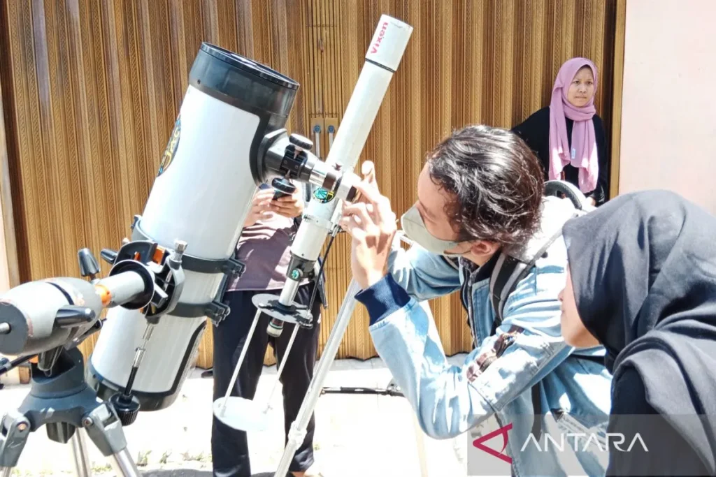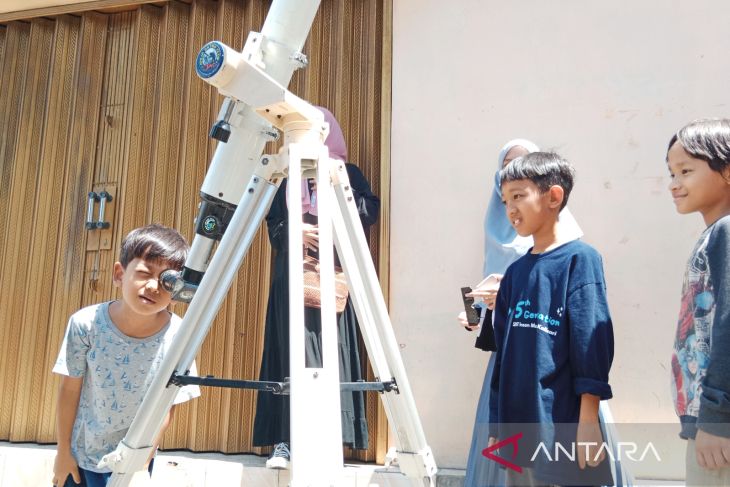 Sejumlah anak ikut mengamati gerhana matahari sebagian di Markas Jogja Astro Club (JAC) di Jalan Gejayan, Condongcatur, Kabupaten Sleman, Daerah Istimewa Yogyakarta, Kamis (20/4/2023) (ANTARA/Luqman Hakim). Sesuai komitmen awal komunitas didirikan, menurut Eko, JAC memang memiliki visi memasyarakatkan astronomi. Selain membuat masyarakat memahami dan mencintai ilmu astronomi, menurut dia, melalui edukasi yang difasilitasi JAC diharapkan tidak ada lagi yang menghubungkan fenomena gerhana dengan hal-hal berbau mistis.